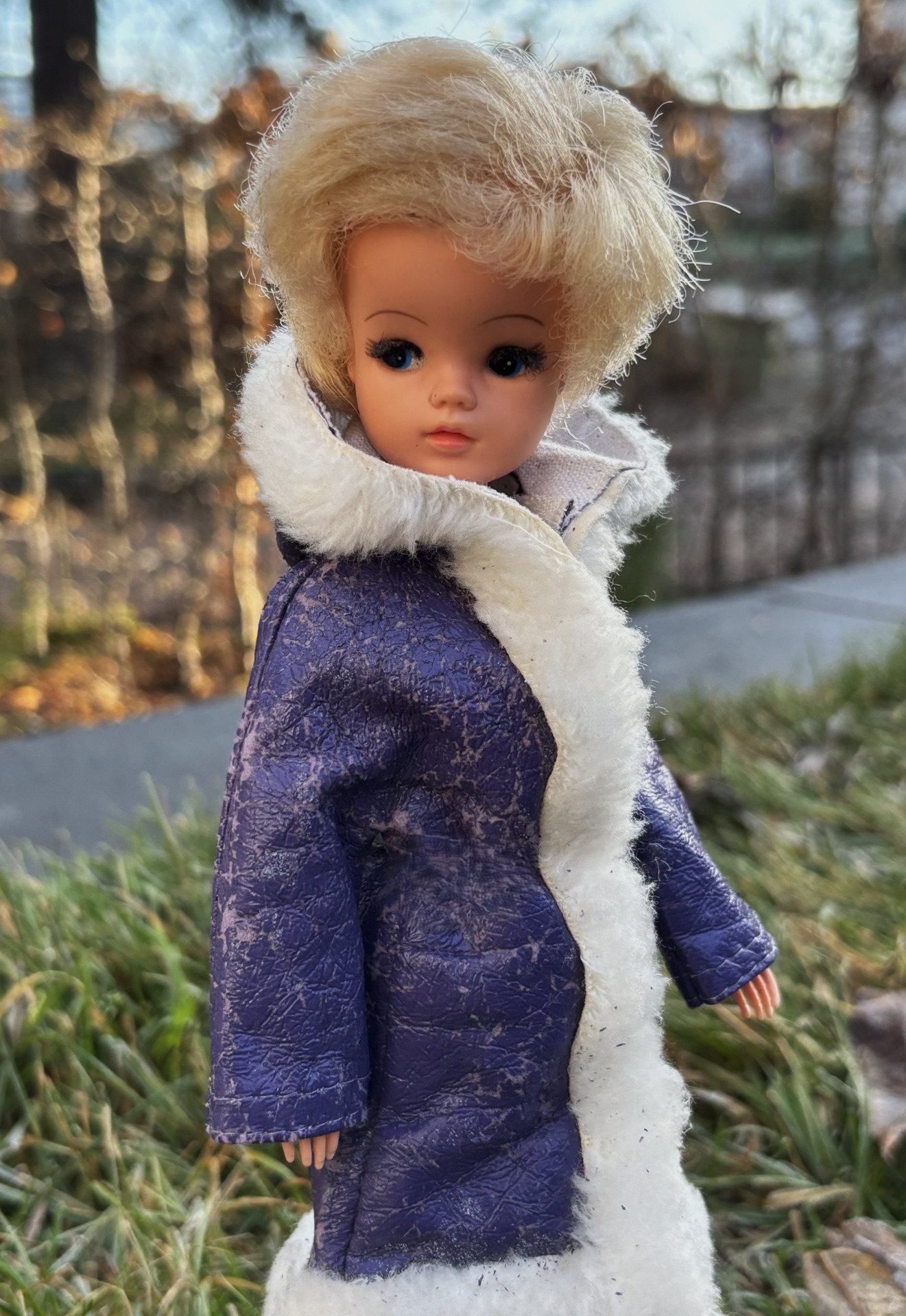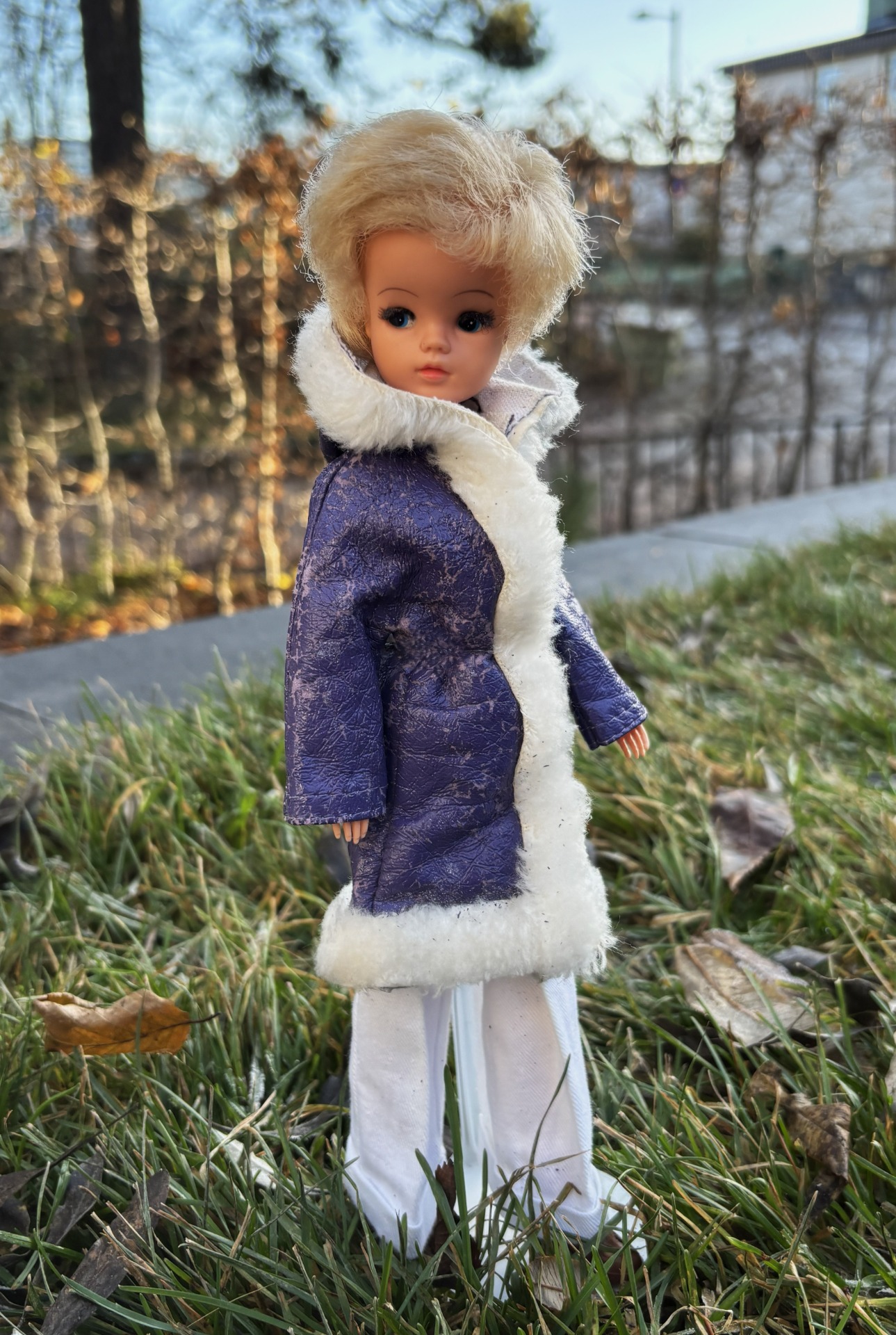 Warm blue hooded coat with faux fur trim and cuffs. White knee boots. Bag in white vinyl and a little blue flower.