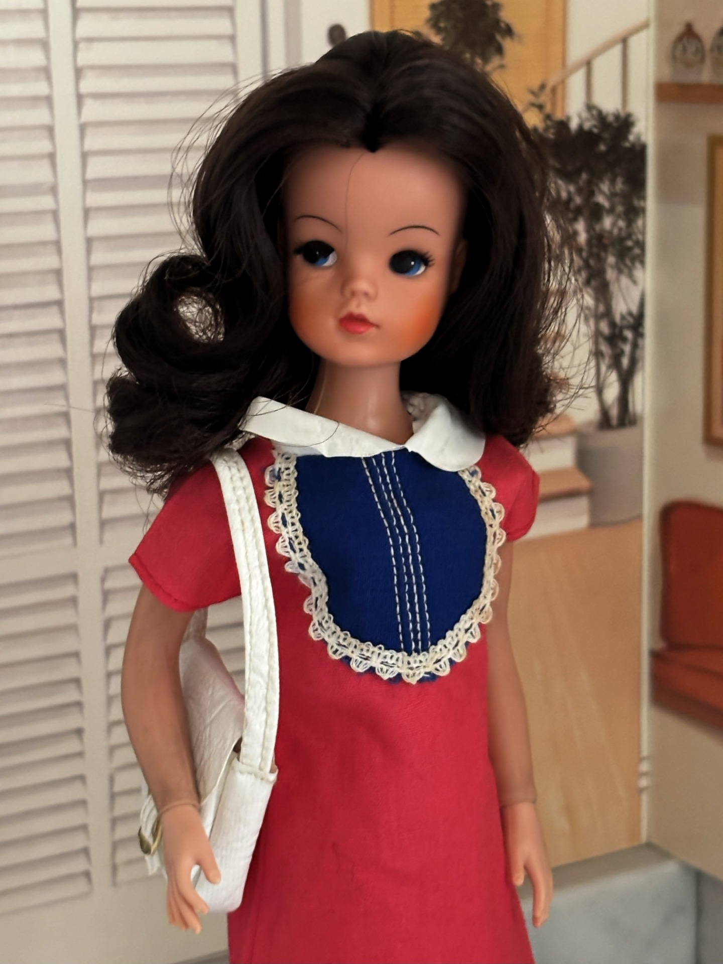 A short-sleeved, pink dress with a navy blue bib inset. The dress has a white plastic Peter Pan collar.
