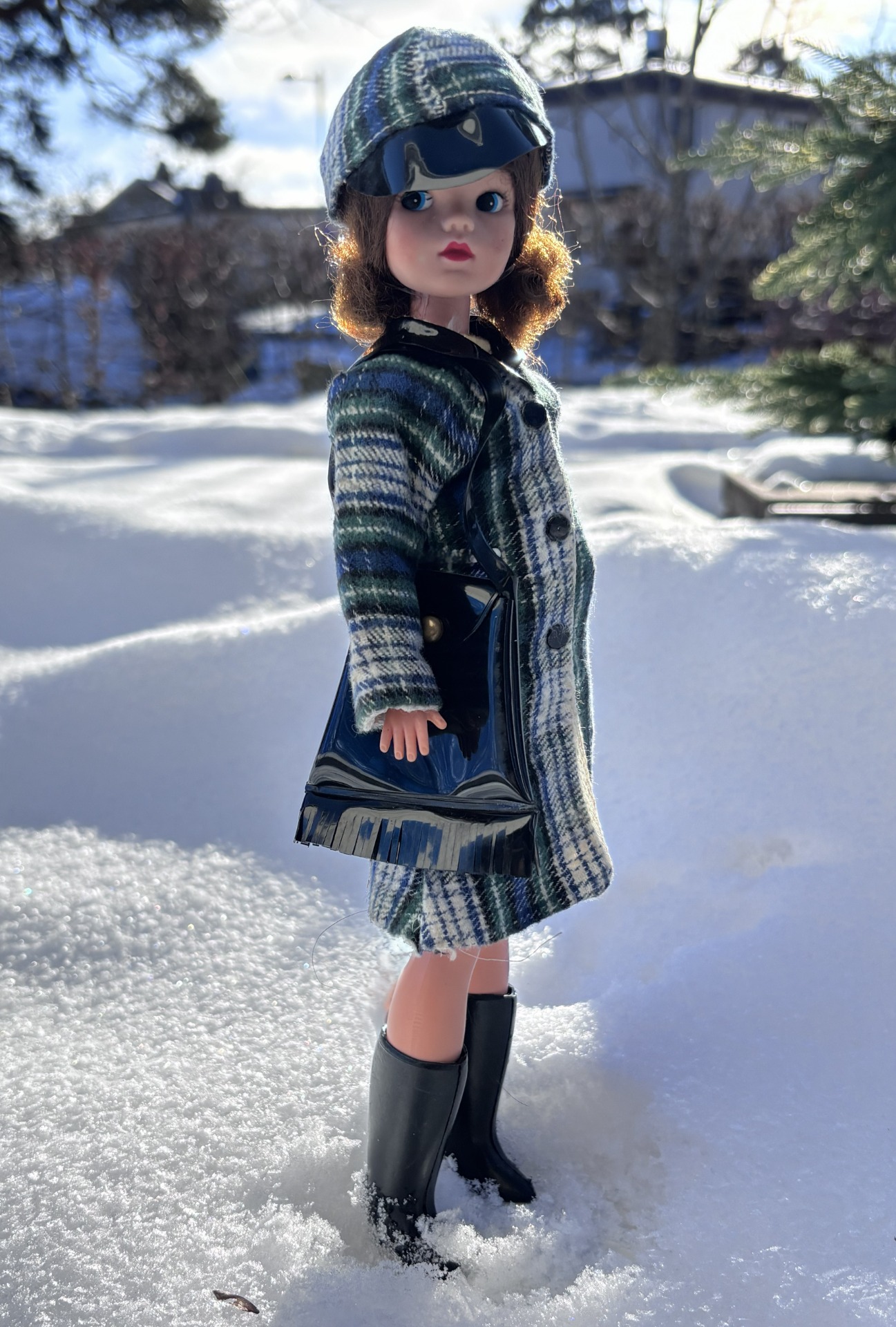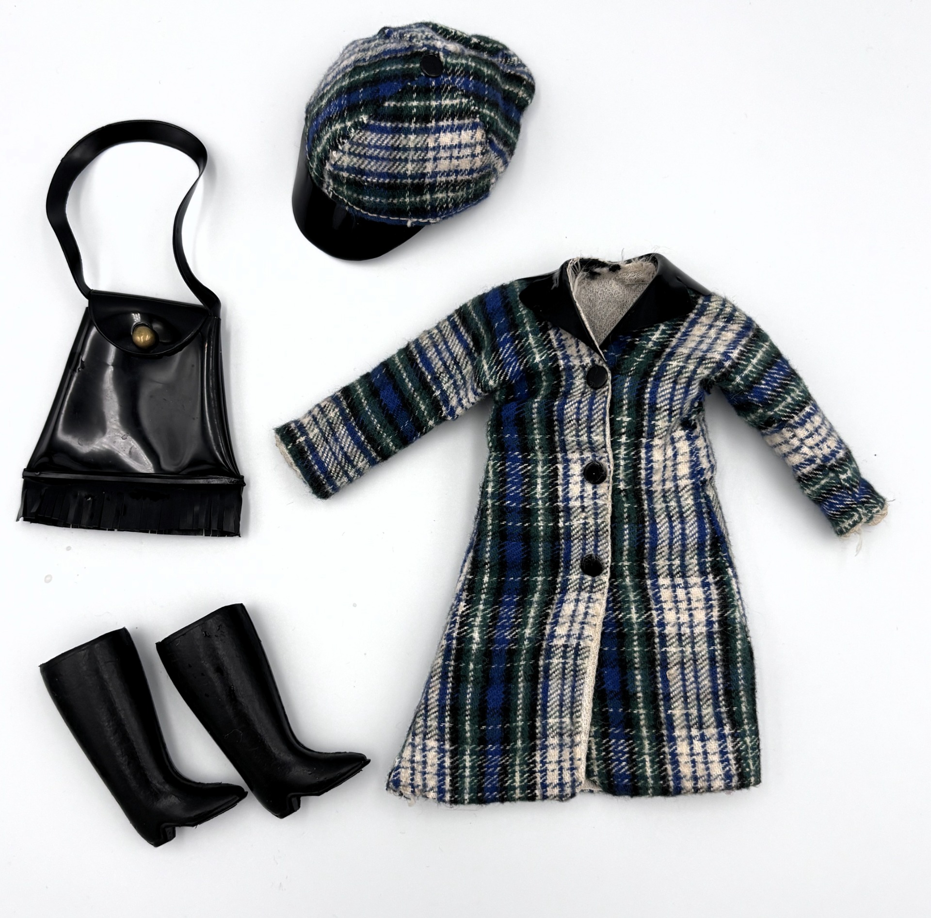 A coat and matching peaked baker's boy cap. A shiny black shoulder bag and a pair of black knee high boots.