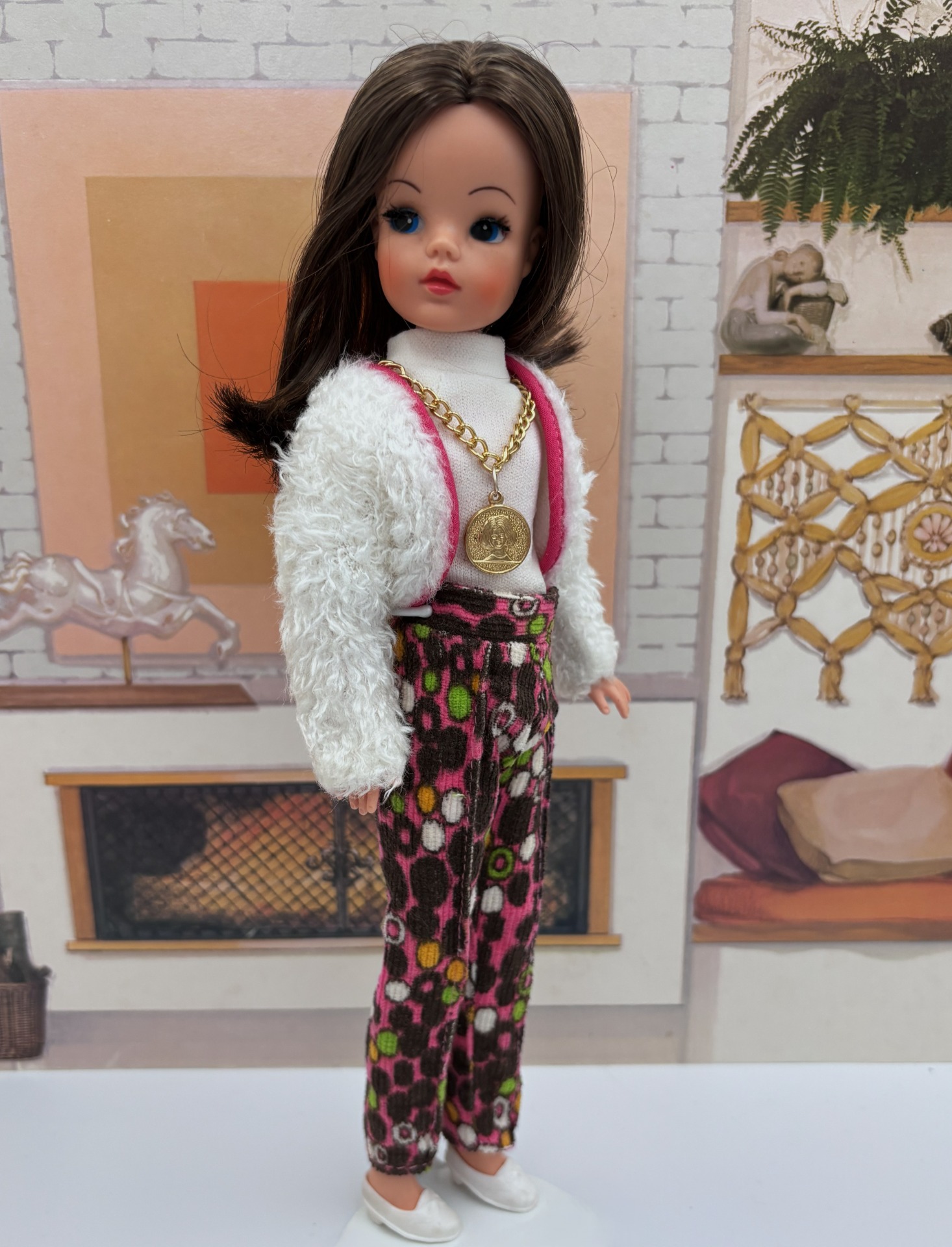 Skinny leg walker outfit. A fluffy faux-sheepskin jacket and pair of multi-coloured pastel striped crimplene trousers. A long-sleeved top made of white nylon with a sewn-on stand-up turtle-neck collar.