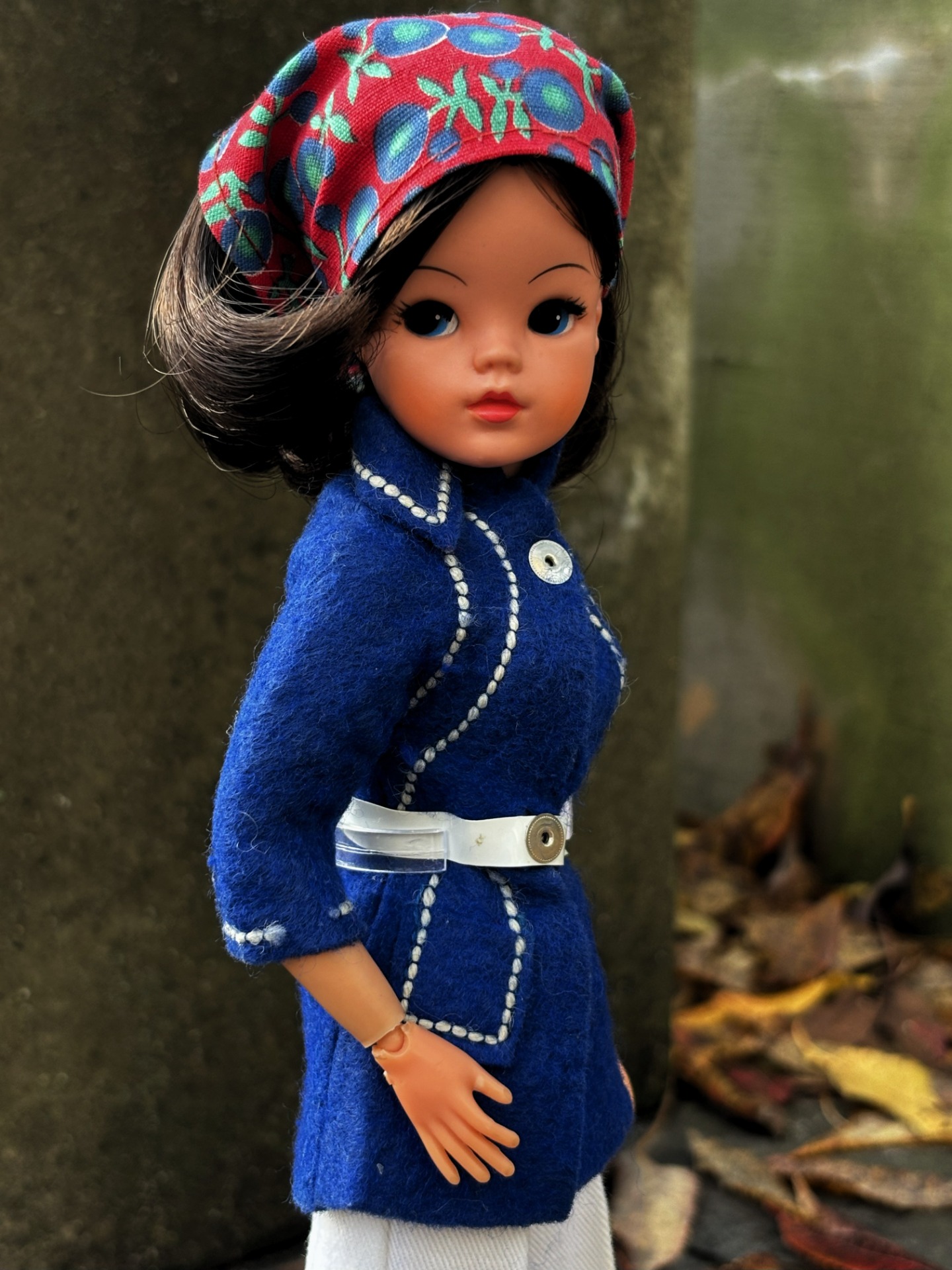 A blue Mini-coat with white saddle stitching and a white plastic belt. A headscarf (at least two different versions) and a pair of red kitten heel court shoes.