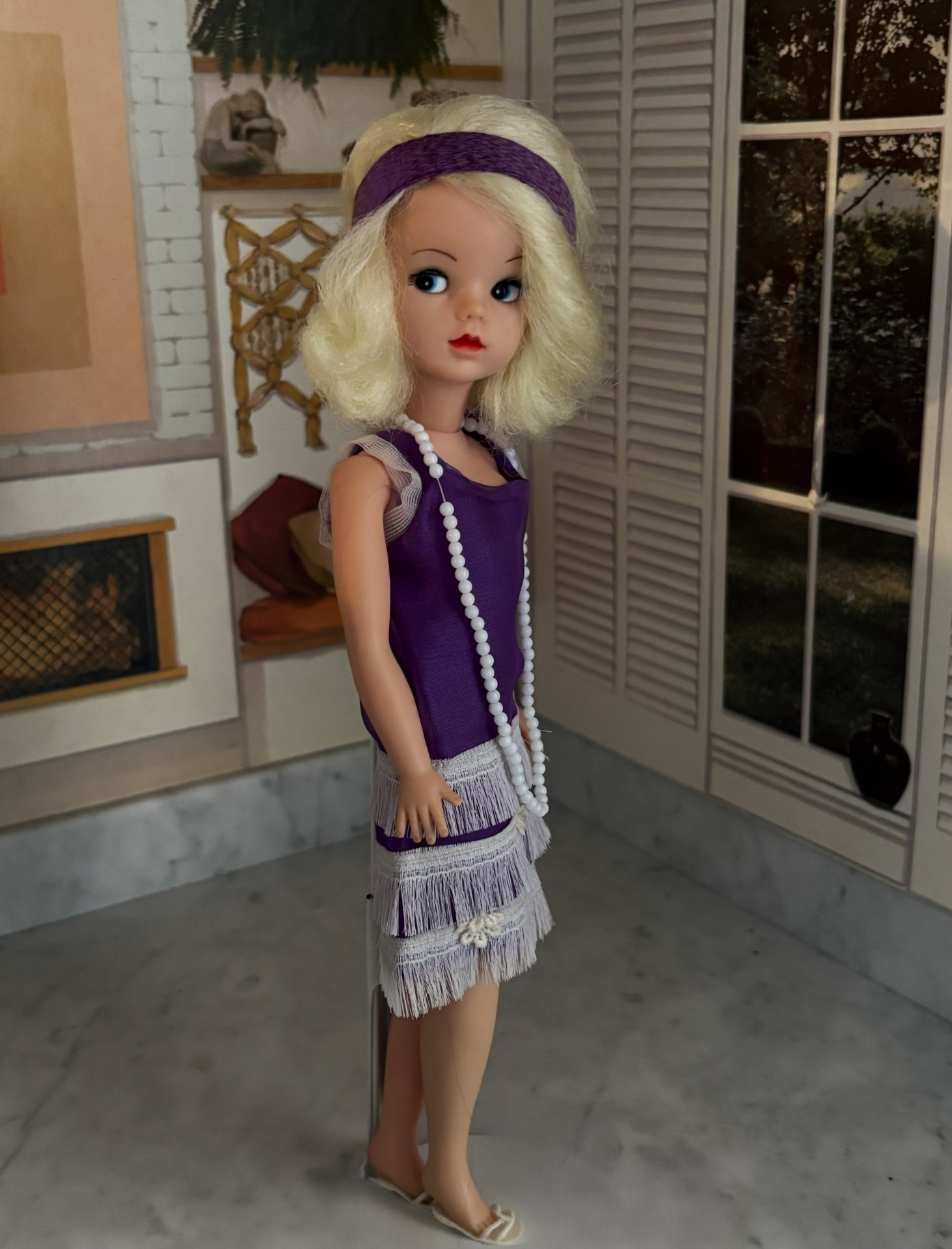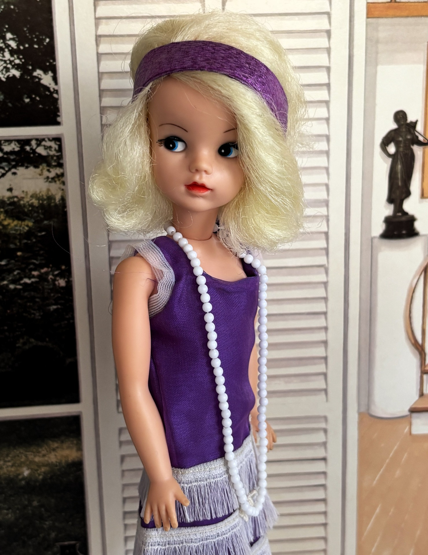 A 1920s flapper-style dress with a matching headband made of a piece of the purple chiffon. A pearl "Charleston" necklace and a pair of backless sandals (black/gold or white)