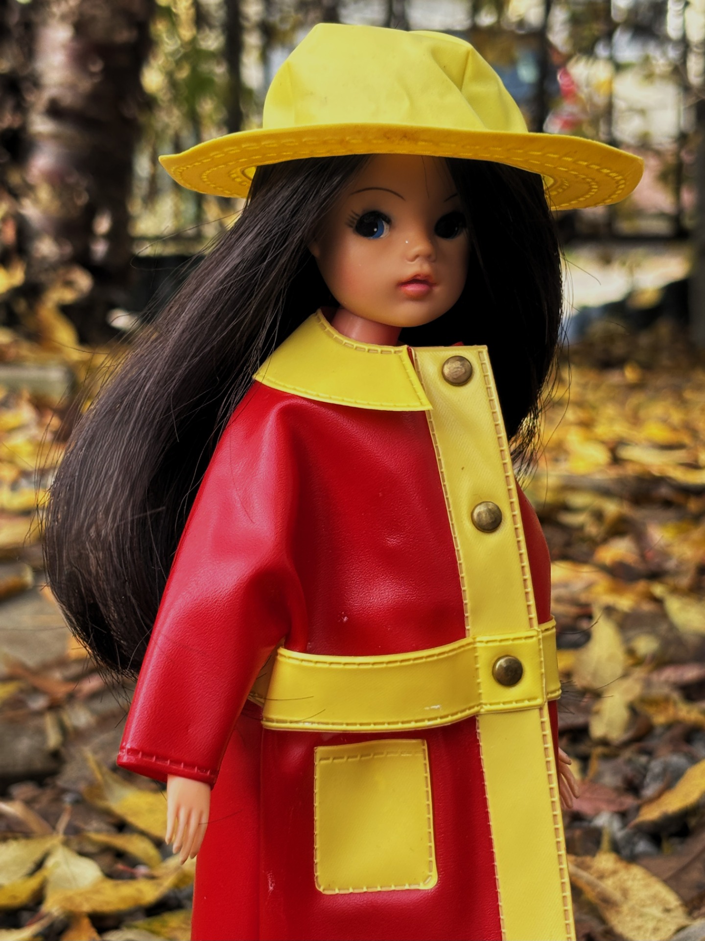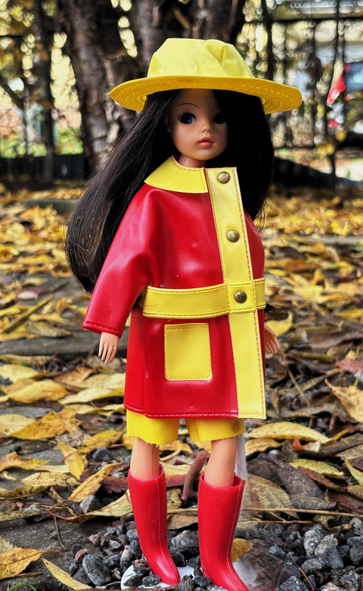 A wide rain coat in bright red with a yellow collar, attached belt and two large patch pockets. A yellow Sou'wester. A pair of yellow Bermuda shorts. The yellow of the hat and shorts match the trim on the coat. A pair of red knee-high boots.