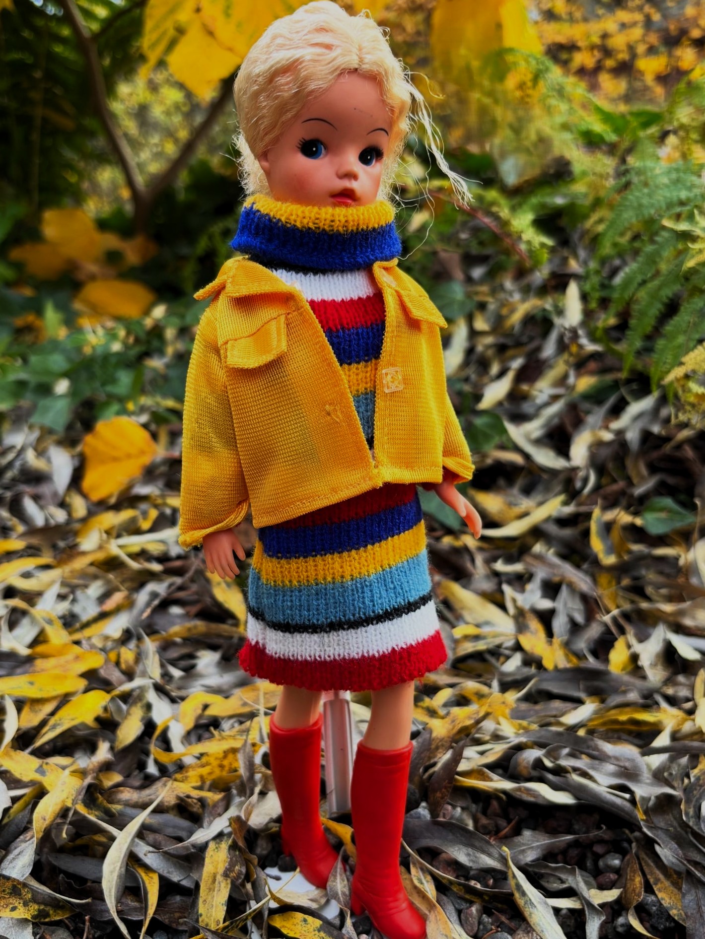 Golden yellow blouse, blue trousers with gathered waist. Red belt and red slip on shoes.
