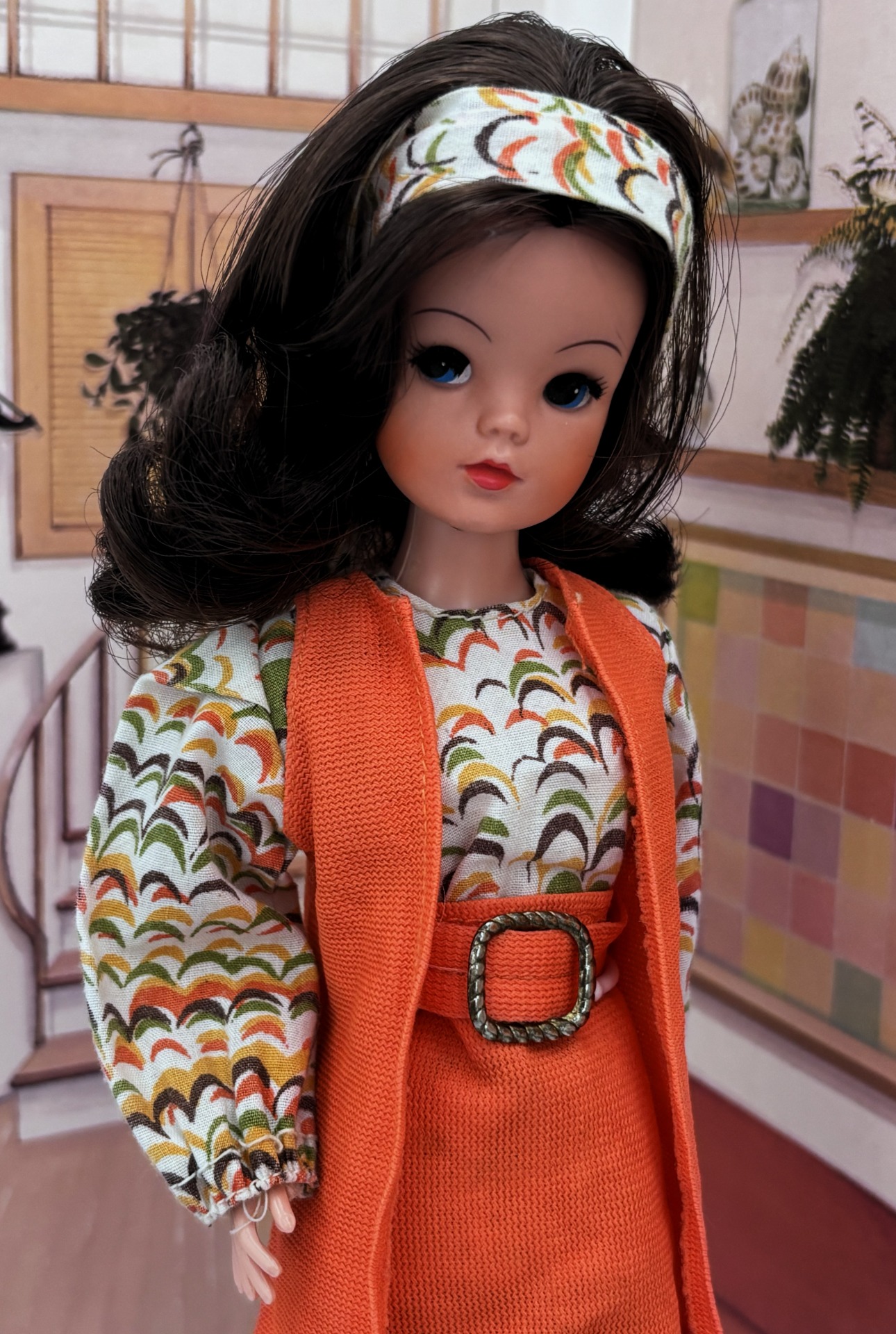 A matching skirt and waistcoat ensemble. A co-ordinating patterned cotton blouse and scarf. popper. A pair of thick nylon aubergine coloured tights and a pair of square-toed white plastic shoes with a moulded buckle.