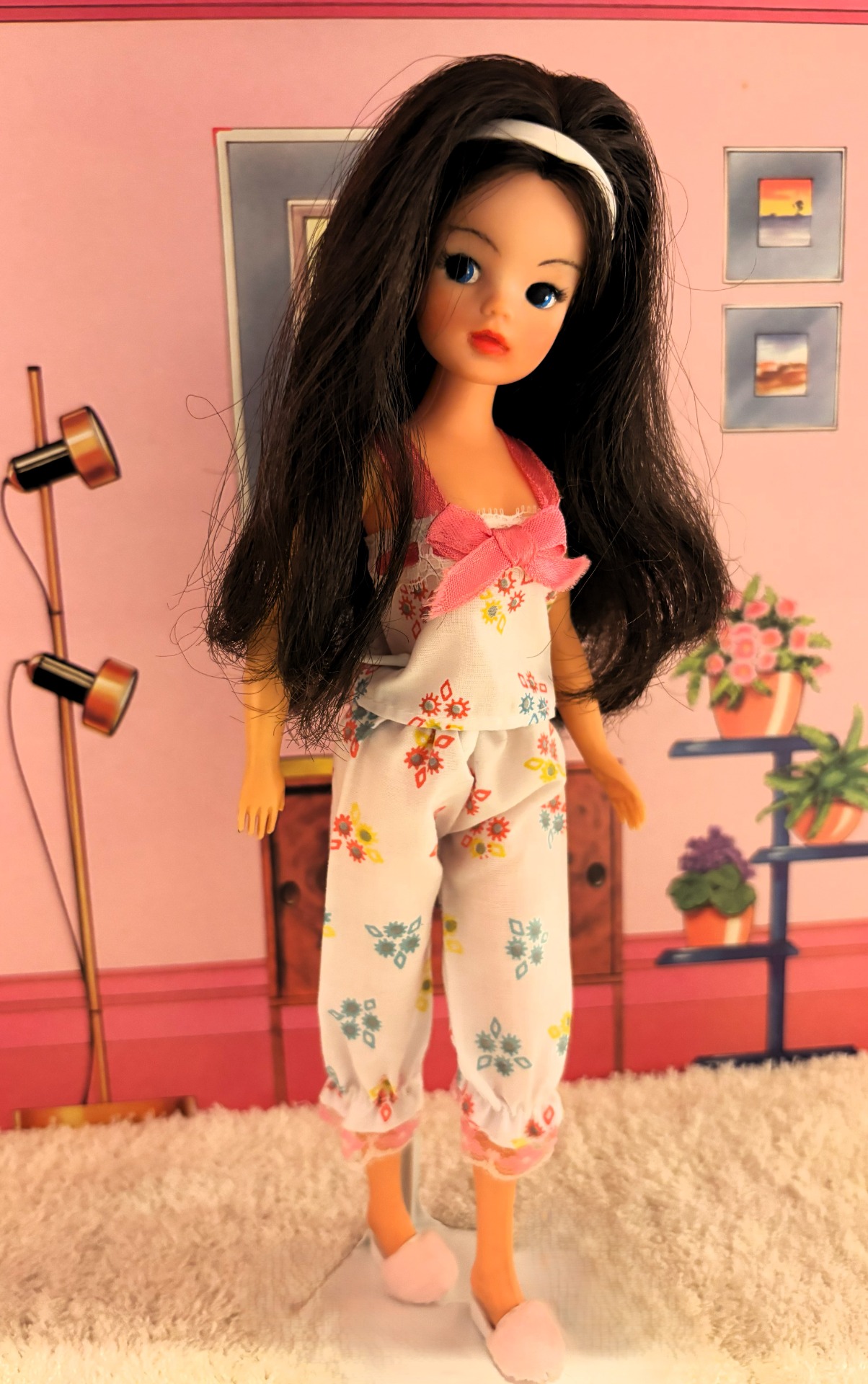 A camisole and cropped trouser pyjama set. This outfit came with a pair of white slip-on mules, covered with pale pink faux fur.