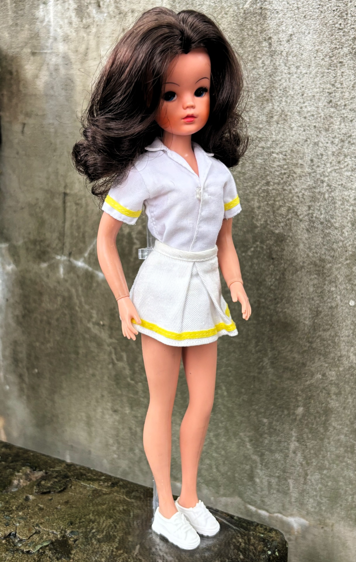 A jacket and jogging bottoms + a tennis shirt with a matching skirt. A pair of white cotton sports knickers and a pair of white trainers.