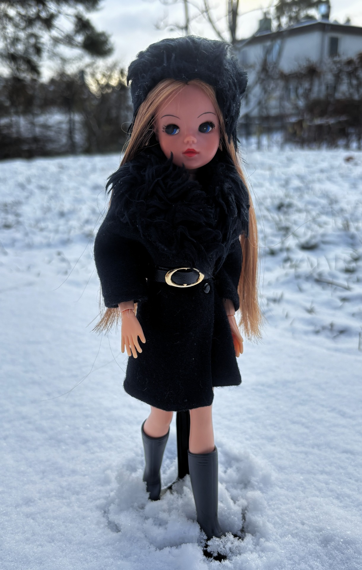 A thick black wool coat with faux fur detail, matching hat. An Umbrella and a pair of black kitten heels. A copy of "Honey" magazine