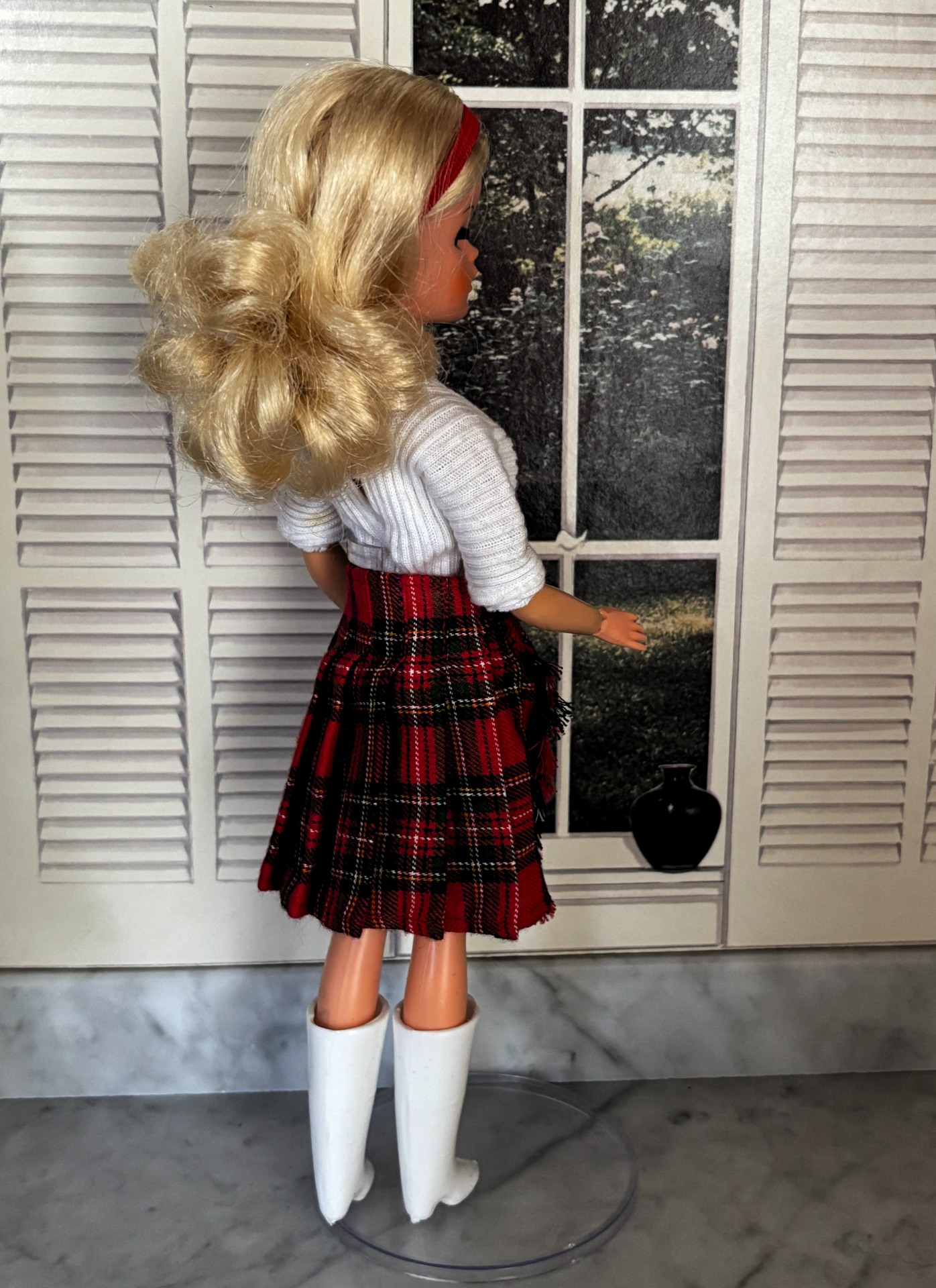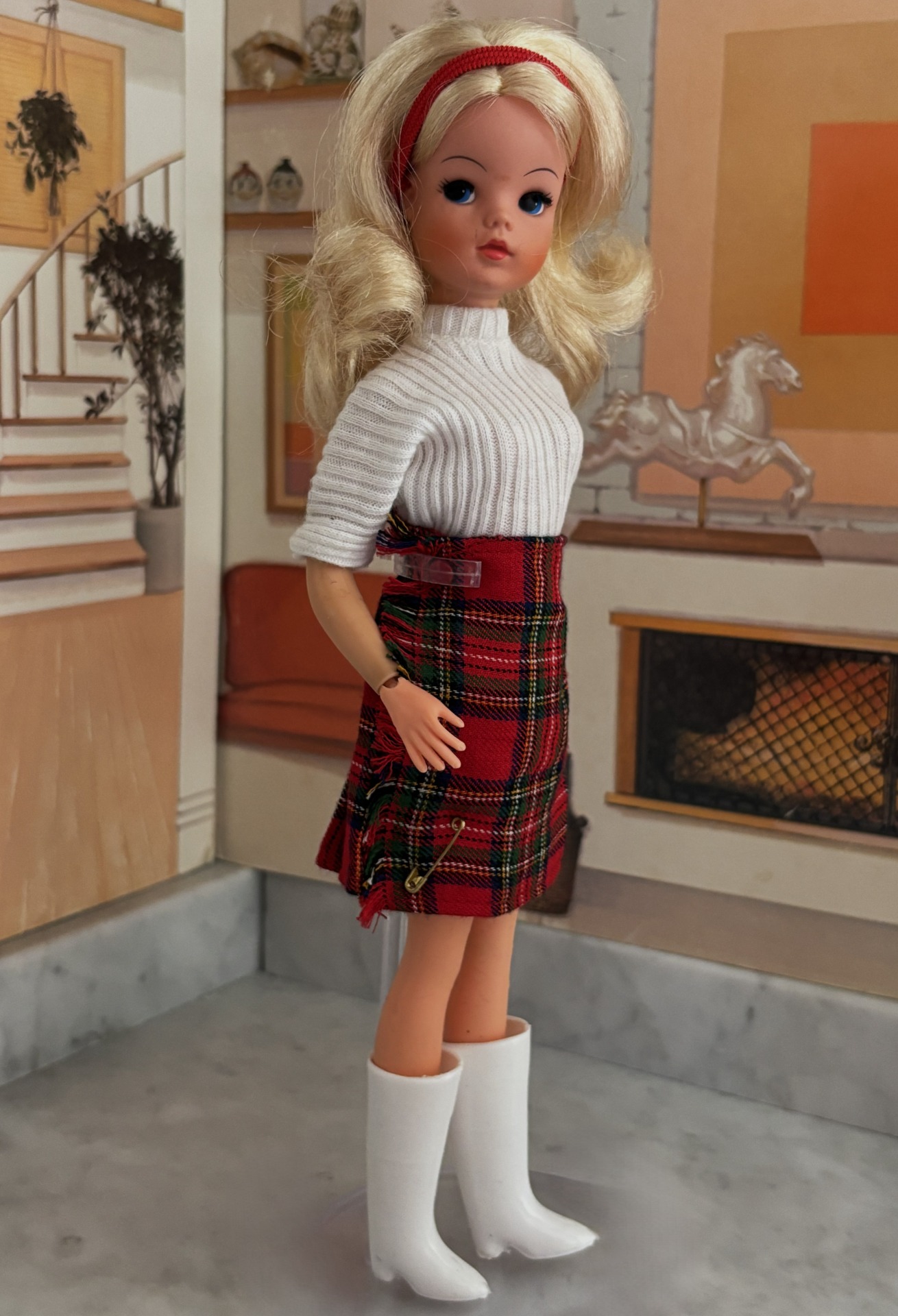 A kilt in a classic tartan fabric. A small brass safety pin acted as a kilt pin.
