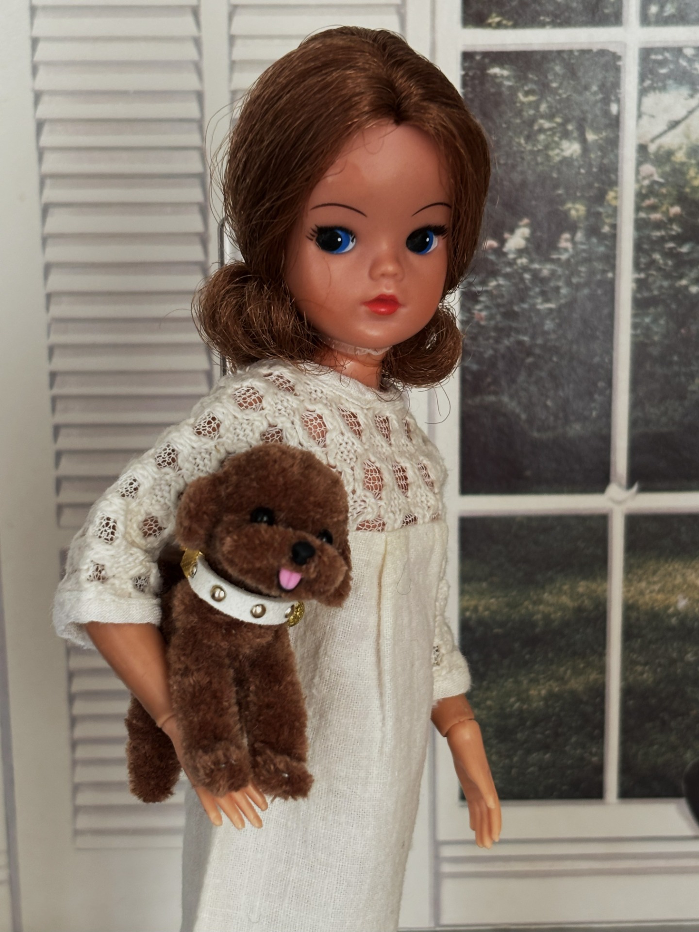 A tiny 'gold' fob watch which fastened on the dress with a tiny brass broach pin. The watch is very detailed with a watch face on one side and the watch mechanism with cogs and screw heads on the back.