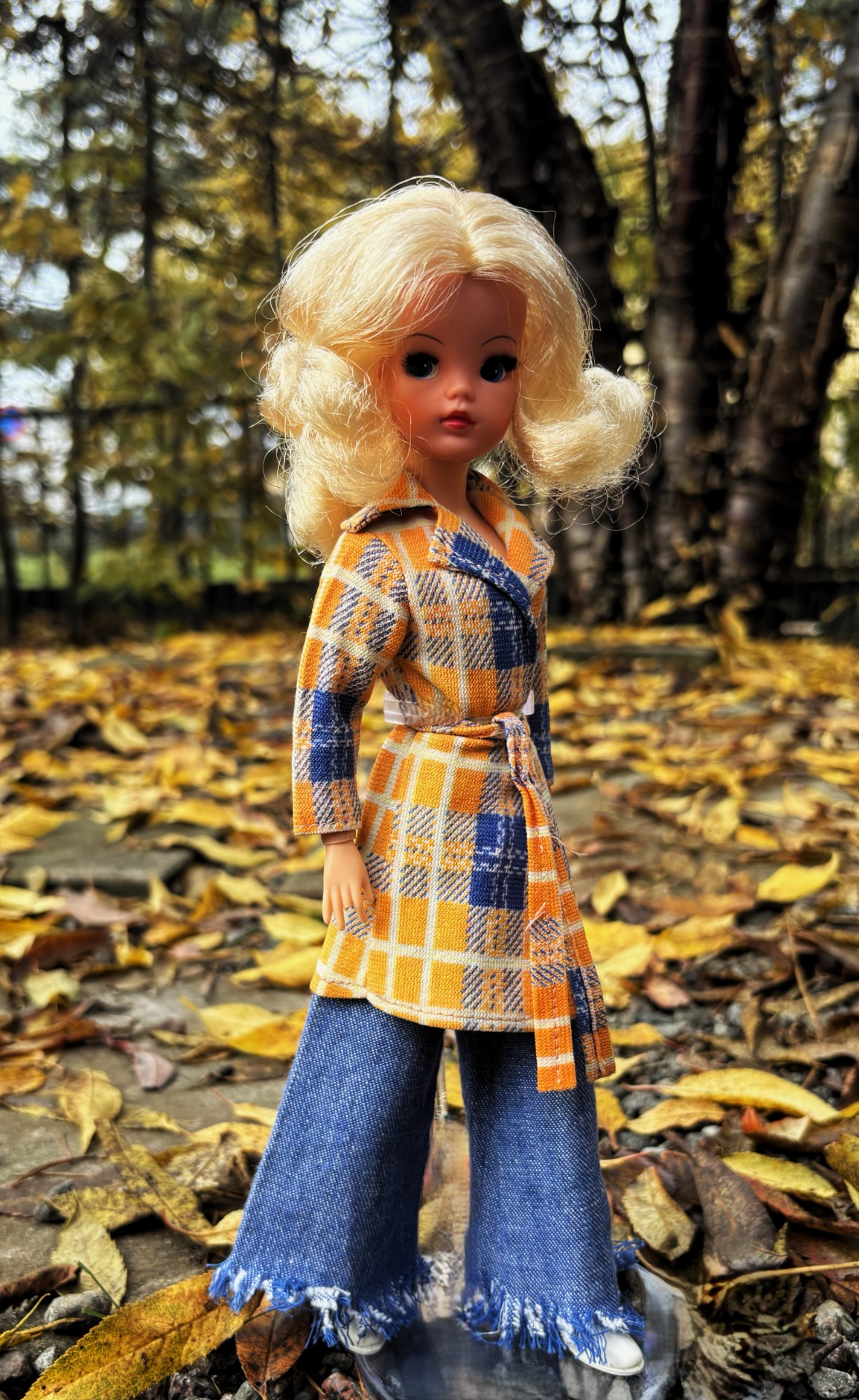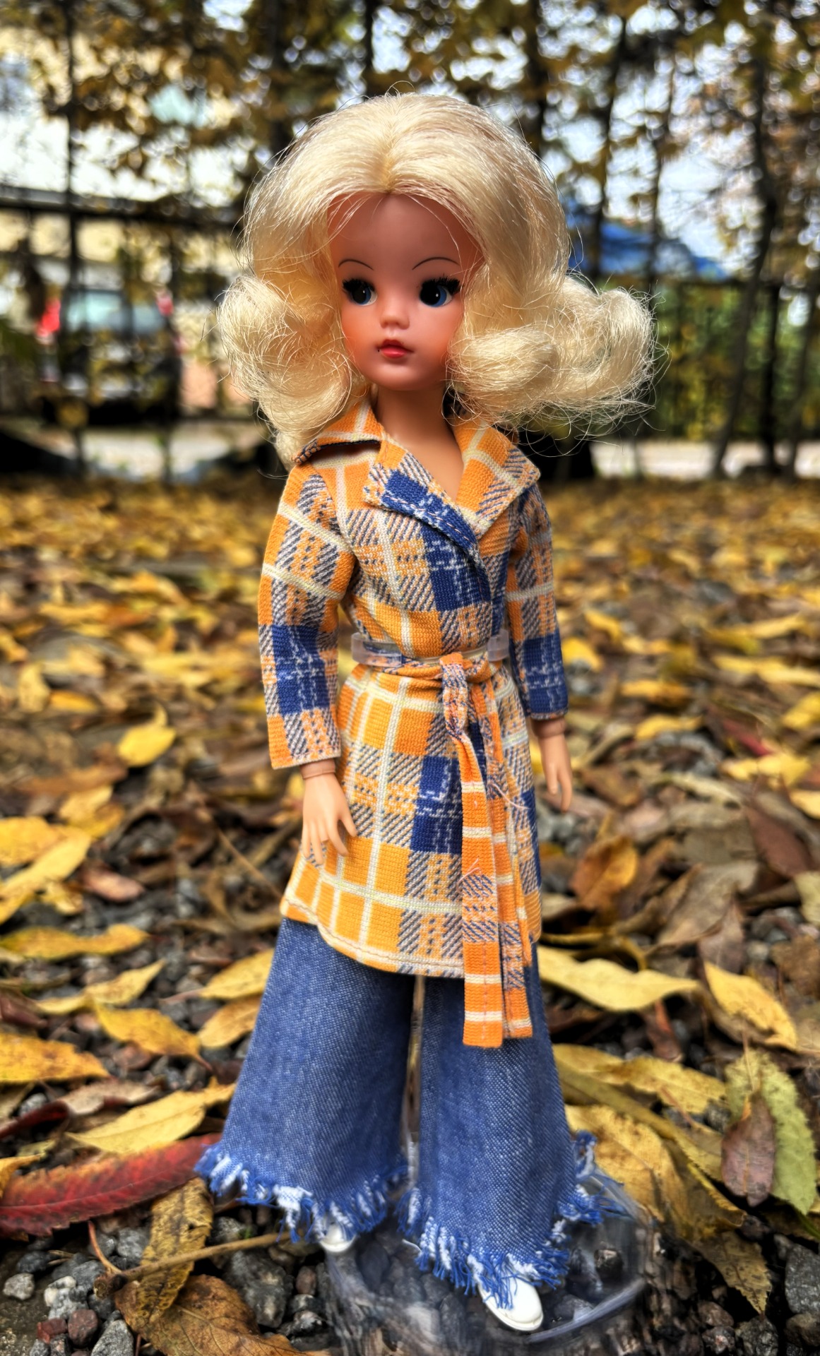 Fashionable pink and blue print coat with matching belt and finished off with a pair of white trendy shoes.