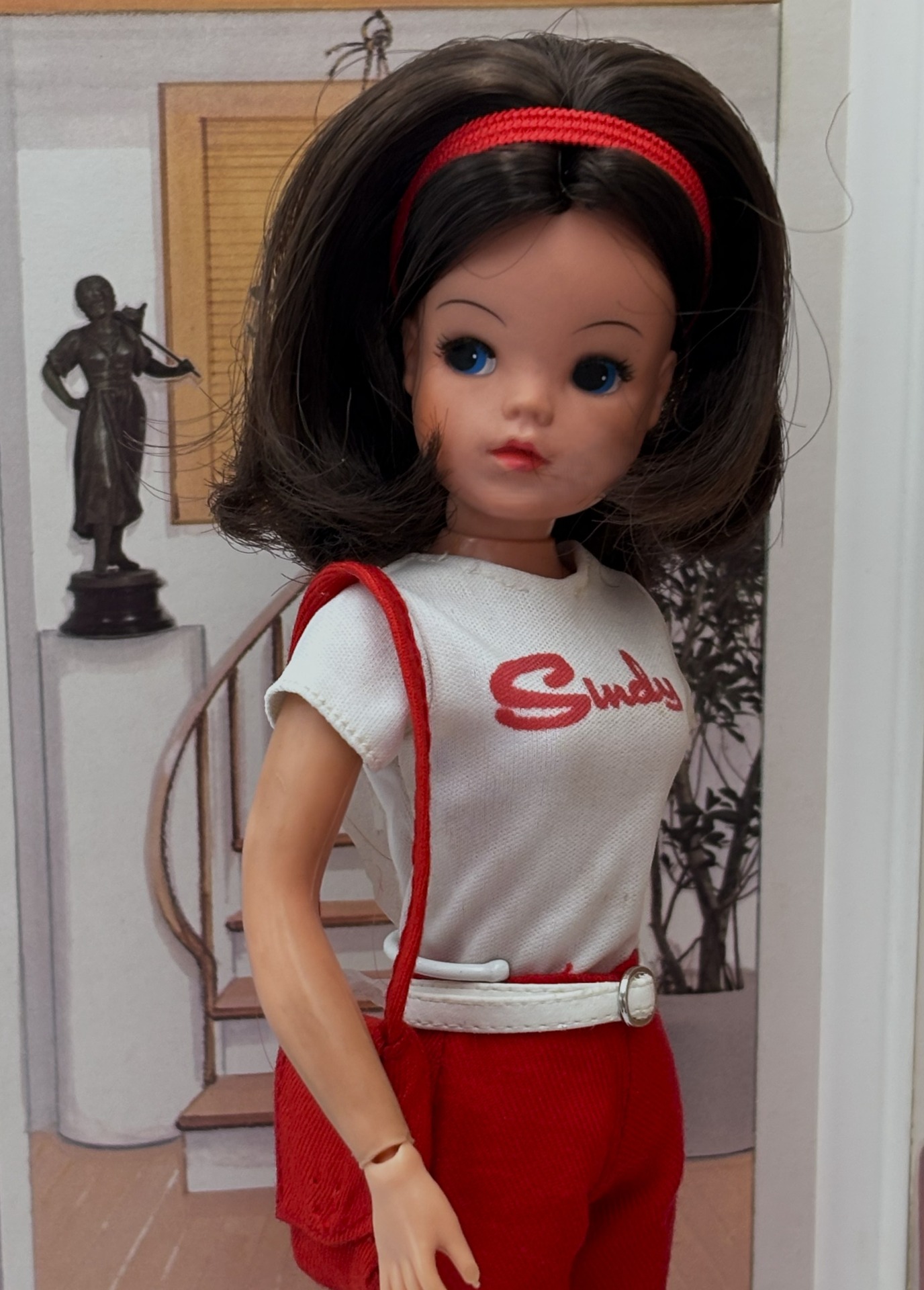 Short sleeved white T-shirt with Sindy logo. Red flared trousers. Red shoulder bag and white slip on shoes.